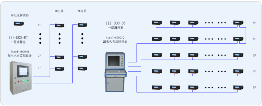 三湘廣場由III-D02-07地塊和III-D08-05地塊各自一獨(dú)棟商業(yè)建筑組成。為了確保本地塊的樓宇的電氣安全,現(xiàn)在樓層內(nèi)的配電箱進(jìn)線端安裝安科瑞品牌ARCM系列漏電流探測器,由此來實(shí)時(shí)監(jiān)測變電所內(nèi)重要回路的漏電流,并在III-D02-07地塊和III-D08-05地塊消控室內(nèi)安裝ACREL-6000電氣火災(zāi)監(jiān)控設(shè)備,以確保變電所配電系統(tǒng)的電氣安全。