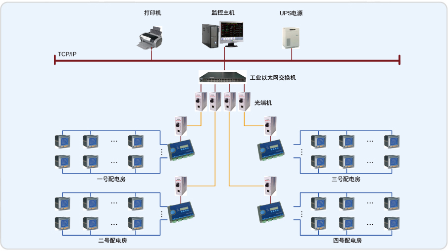浦江雙輝大廈監(jiān)控部分有1個(gè)35kV配電室, 1#、2#、3#、4#、5#5個(gè)配電室分10kV高壓和0.4kV低壓。35kV配電室有高壓電力儀表、綜保和2臺(tái)變壓器溫控儀,另外5個(gè)配電室有10kV高壓電力儀表和綜保,0.4kV低壓部分有電力儀表和22臺(tái)變壓器溫控儀。35kV和1#配電室分布在A棟的B2層,2#配電室分布在B棟的B2層,3#配電室分布在A棟的33樓,4#配電室分布在B棟的33樓,5#配電室分布在A棟的B4層。針對(duì)浦江雙輝大廈的實(shí)際情況,通過計(jì)算機(jī)和通訊網(wǎng)絡(luò),將分散的配電所的現(xiàn)場(chǎng)設(shè)備連接為一個(gè)有機(jī)的整體,實(shí)現(xiàn)電網(wǎng)設(shè)備運(yùn)行的遠(yuǎn)程監(jiān)控和集中管理。
