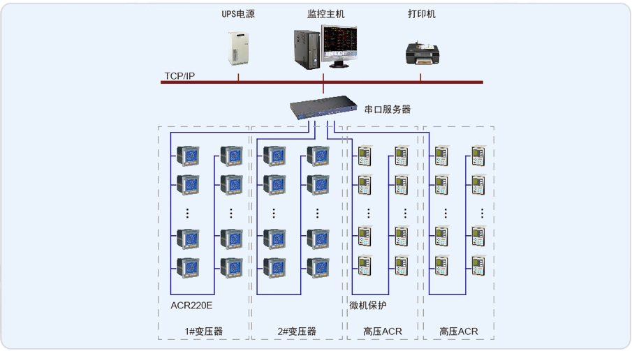 現(xiàn)場(chǎng)設(shè)備層設(shè)備為600臺(tái)電力儀表。這些設(shè)備分別根據(jù)設(shè)計(jì)要求安裝在相應(yīng)的配電回路上。通過RS-485接口實(shí)現(xiàn)與上位機(jī)系統(tǒng)的數(shù)據(jù)交互。多功能表的通訊規(guī)約為Modbus-RTU;通訊管理層由2臺(tái)Nport-5630串口服務(wù)器構(gòu)成。串口服務(wù)器將RS-485總線協(xié)議轉(zhuǎn)換為工業(yè)以太網(wǎng)協(xié)議,通過TCP/IP與站控管理層主機(jī)相連,構(gòu)建數(shù)據(jù)鏈路。通訊管理層設(shè)備均安裝在電氣值班室的值班人員操作臺(tái)中,與站控管理層設(shè)備安裝在一起;站控管理層設(shè)備為華北工控主機(jī)、顯示器、HP打印機(jī)以及山特UPS電源,均安裝在電氣值班室的操作臺(tái)中。通過安裝在主機(jī)上的Acrel-2000電力監(jiān)控系統(tǒng)軟件實(shí)現(xiàn)對(duì)現(xiàn)場(chǎng)儀表數(shù)據(jù)的采集、處理以及各種人機(jī)交互功能。