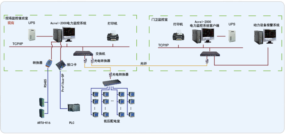 飛浦電子技術(shù)(上海)有限公司動力房設(shè)備報警系統(tǒng),是在現(xiàn)有報警系統(tǒng)的基礎(chǔ)上進(jìn)行的智能化改造項(xiàng)目。原有系統(tǒng)基于西門子PLC采集現(xiàn)場各種傳感器變位或報警信號,再通過聲、光形式輸出報警信號。為了便于管理和維護(hù),將動力房設(shè)備報警系統(tǒng)PLC數(shù)據(jù)以及部分未接入PLC的報警開關(guān)量通過安科瑞ARTU裝置采集至現(xiàn)有的安科瑞Acrel-2000電力監(jiān)控系統(tǒng);在門衛(wèi)監(jiān)控室增加兩臺監(jiān)控計(jì)算機(jī),一臺作為安科瑞Acrel-2000電力監(jiān)控系統(tǒng)客戶端,另一臺整合了動力房設(shè)備報警系統(tǒng)遠(yuǎn)程訪問客戶端;原監(jiān)控值班室和門衛(wèi)值班室之間通過光纖組建局域網(wǎng),實(shí)現(xiàn)系統(tǒng)遠(yuǎn)程監(jiān)控。