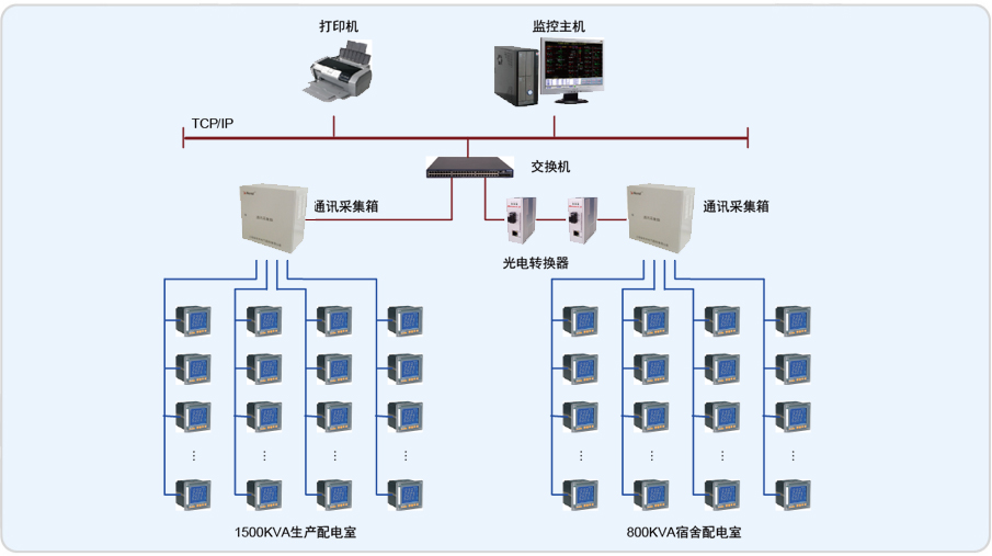 山東電力管道工程公司有兩個配電室:容量1500KVA的生產配電室和800KVA的宿舍配電室,兩個配電室距離約1500米,為實現配電系統(tǒng)的規(guī)范化管 理,對舊的配電系統(tǒng)進行改造,兩配電室內的老式指針式儀表更換為上海安科瑞公司的網絡電力儀表,配套Acrel-2000電力監(jiān)控軟件對現場進行監(jiān)控,監(jiān)控室位于生產配電室內。為滿足兩個配電室統(tǒng)一監(jiān)控的要求,容量1500KVA的生產配電室和800KVA的宿舍配電室通過一根單模四芯的光纖相連,經光電轉換后接入網絡交換機,進而實現對現場數據的采集,存儲,處理,實時顯示以及歷史查詢。