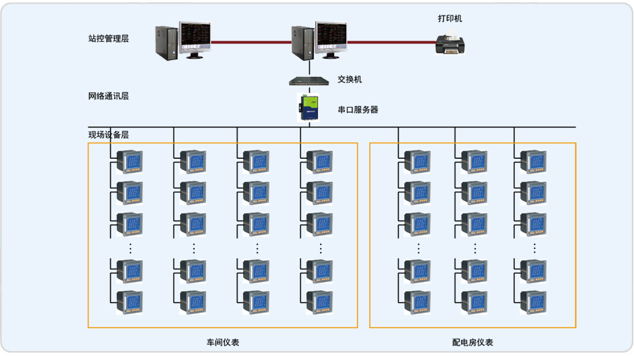整個(gè)低壓配電系統(tǒng)包括20個(gè)低壓配電柜。其中三個(gè)進(jìn)線柜,三個(gè)電容補(bǔ)償柜,兩個(gè)母聯(lián)和12個(gè)出線柜,12個(gè)出線回路的負(fù)載基本上是三相大功率電機(jī)。各配電柜內(nèi)安裝有本公司PZ80L-E4/C 儀表共80只。整個(gè)系統(tǒng)分11根總線接入工業(yè)級(jí)串口服務(wù)器,組網(wǎng)至電力監(jiān)控系統(tǒng)。