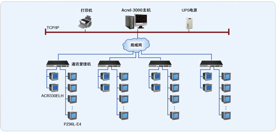 該系統(tǒng)總計有79只儀表(其中包括8只ACR330ELH諧波儀表,71只PZ系列智能儀表),分8條總線,由于四個變電所之間距離較遠(yuǎn),并且較為分散,采用每個變電所內(nèi)自行組網(wǎng),然后并入惠氏公司內(nèi)部局域網(wǎng)的方式,實(shí)該現(xiàn)場總線上儀表與監(jiān)控主機(jī)的數(shù)據(jù)連通。