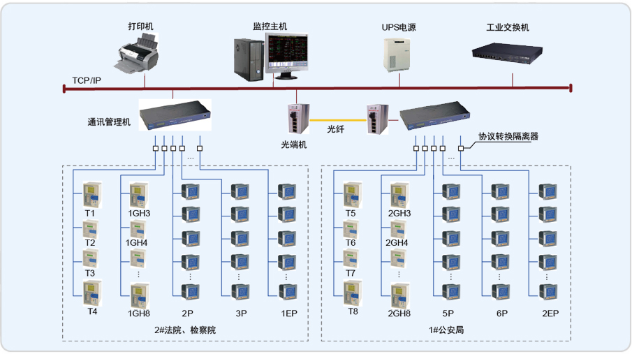 該項(xiàng)目有1#(公安局)、2#(法院、檢察院)兩個(gè)變配電室,室內(nèi)的配電柜中安裝了安科瑞332塊PZ系列可編程智能電測表。為了能夠?qū)崿F(xiàn)電力參數(shù)實(shí)時(shí)遙測、電能計(jì)量、電能報(bào)表等功能,系統(tǒng)采用Acrel-3000電能管理軟件,做到集中管理、集中控制,省去了值班人員現(xiàn)場抄表的煩瑣,具有投資少、簡明實(shí)用、便于智能管理等優(yōu)點(diǎn)。