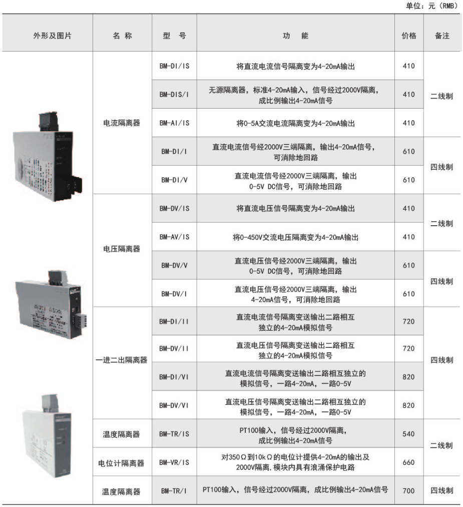 BM系列模擬信號隔離器可以對電流、電壓等電量參數或溫度、電阻等非電量參數進行高速精確測量,經隔離轉換成標準的模擬信號輸出。既可直接與指針表、數顯表相接,也可以與自控儀表(如PLC)、各種A/D轉換器以...