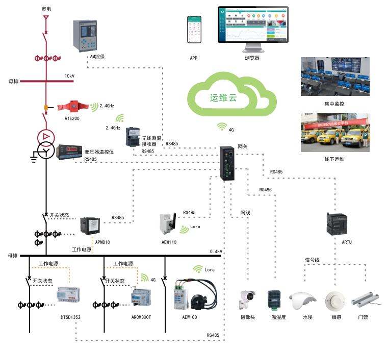 可配置遙信變位報警(水浸、煙霧、門磁、開關(guān)跳閘等)、遙測越限報警(過壓、欠壓、過流、線纜溫度過高、繞組溫度過高等)、運(yùn)行報警(儀表離線、網(wǎng)關(guān)離線等),并將接收到的報警通過短信、網(wǎng)頁推送,報警上下限可根據(jù)現(xiàn)場情況靈活配置;