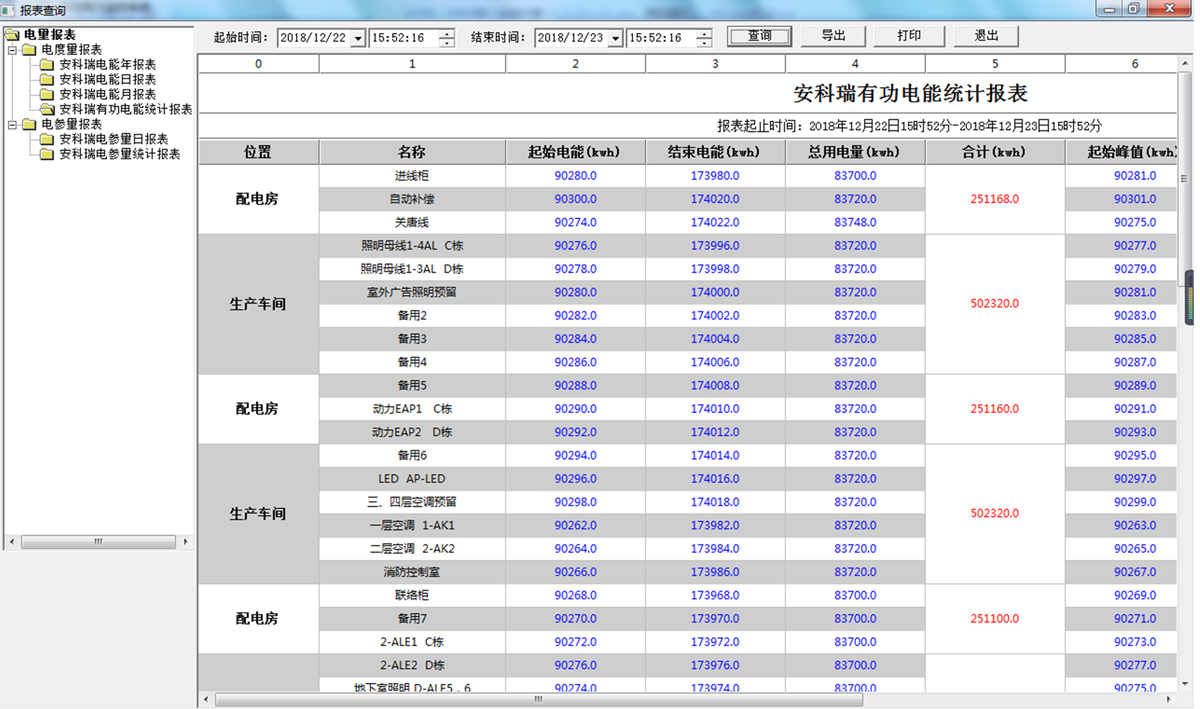 系統(tǒng)具備定時(shí)抄表匯總統(tǒng)計(jì)功能,用戶可以自由查詢自系統(tǒng)正常運(yùn)行以來(lái)任意時(shí)間段內(nèi)各配電節(jié)點(diǎn)的用電情況。