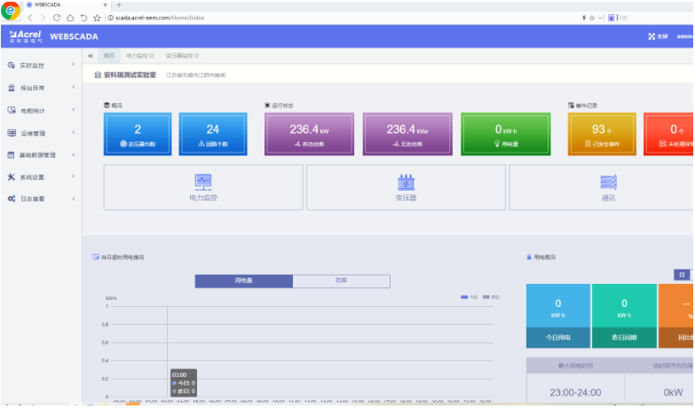 展示頁(yè)面顯示變電站數(shù)量、變壓器數(shù)量、監(jiān)測(cè)點(diǎn)位數(shù)量等概況信息,設(shè)備通信狀態(tài),用電分析和事件記錄。